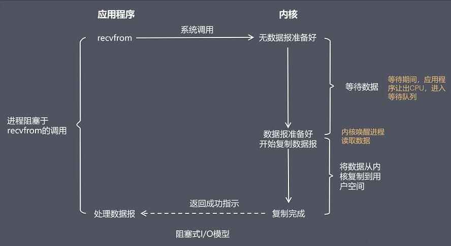 阻塞 IO 模型:应用进程被阻塞,直到数据从内核缓冲区复制到应用进程缓冲区中才返回。