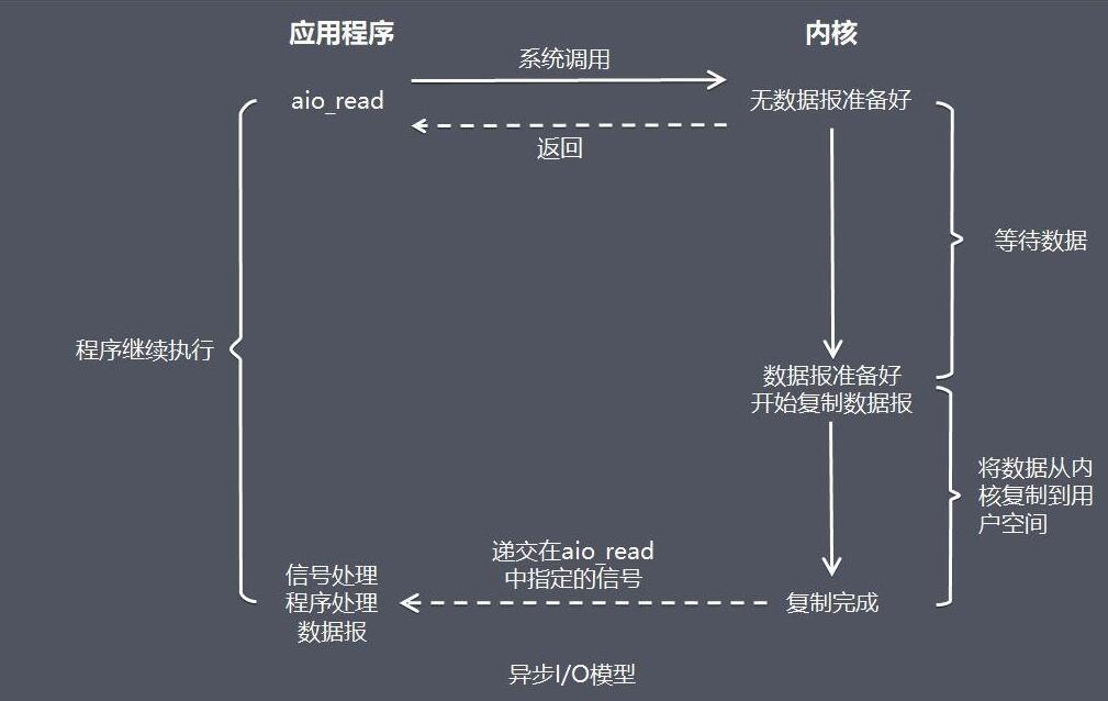 异步 IO 模型:当进程发起一个 IO 操作,进程返回不阻塞,但也不能返回结果;内核把整个 IO 处理完后,会通知进程结果。如果IO操作成功则进程直接获取到数据。