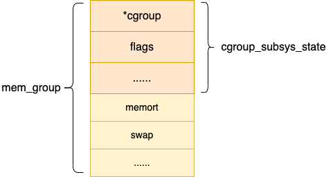 对于内存子系统控制统计信息结构是 mem_cgroup,其它子系统也类似。