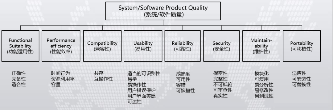 ISO/IEC 25010:2011标准中,表述的软件质量特性模型如下,一共包含了8个特性,分别是功能适应性、性能效率、兼容性、易用性、可靠性、安全性、维护性、可移植性。每个特性下,又有一些子特性,一共31个子特性。