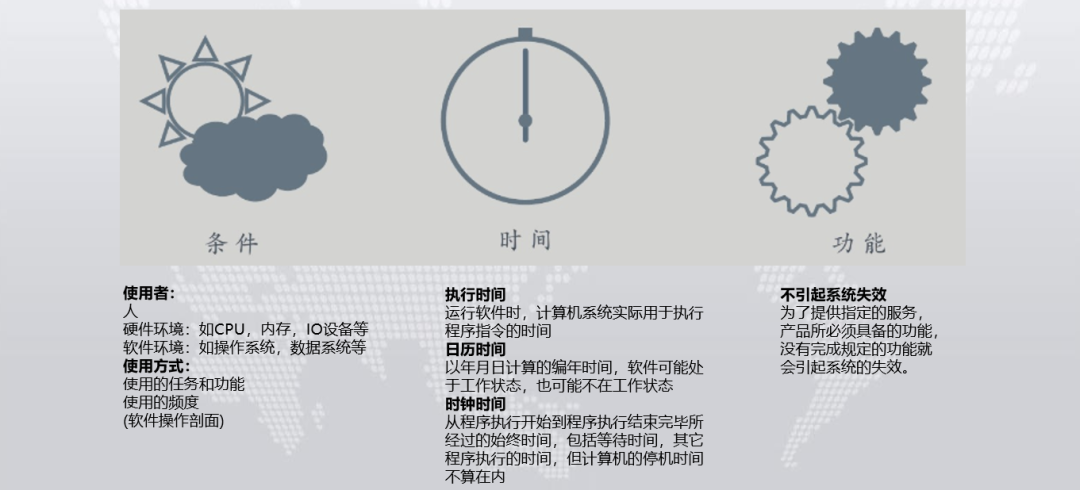 规定条件,包含的主要是使用者和使用方式。使用者包含了人、软硬件环境。使用方式指使用的任务和功能,以及使用的频度,我在括号里写了软件操作剖面。你可以理解为不同角色使用不同功能的频率,在后面的软件可靠性测试文章中,我会举一个例子,使得大家明白软件操作剖面是个什么意思,这篇文章不讲。