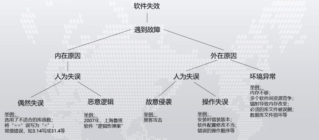 软件失效,是因为在运行过程中遇到了故障,这些故障的产生有内在和外在原因,可以用下面这个图帮助理清。