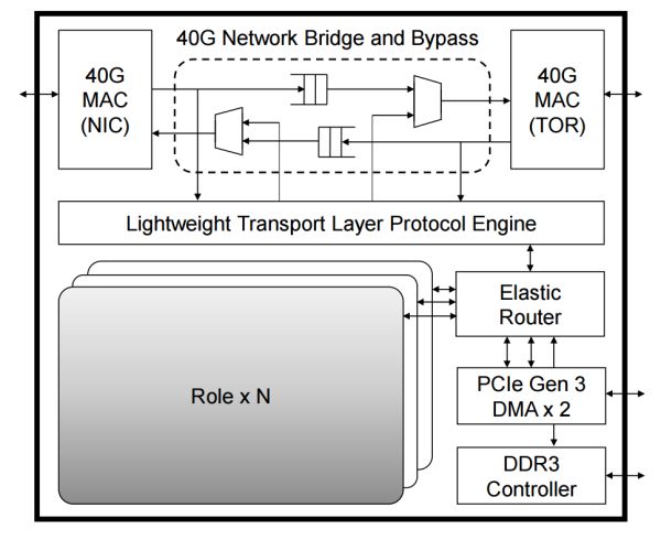 FPGA 内的逻辑模块关系,其中每个 Role 是用户逻辑(如 DNN 加速、网络功能加速、加密),外面的部分负责各个 Role 之间的通信及 Role 与外设之间的通信。来源:[4]