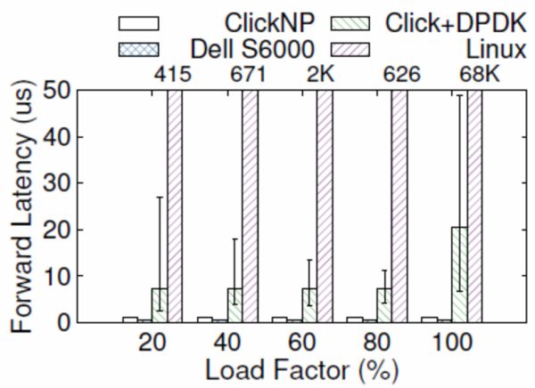 ClickNP(FPGA)与 Dell S6000 交换机(商用交换机芯片)、Click+DPDK(CPU)和 Linux(CPU)的转发延迟比较,error bar 表示 5% 和 95%。来源:[5]