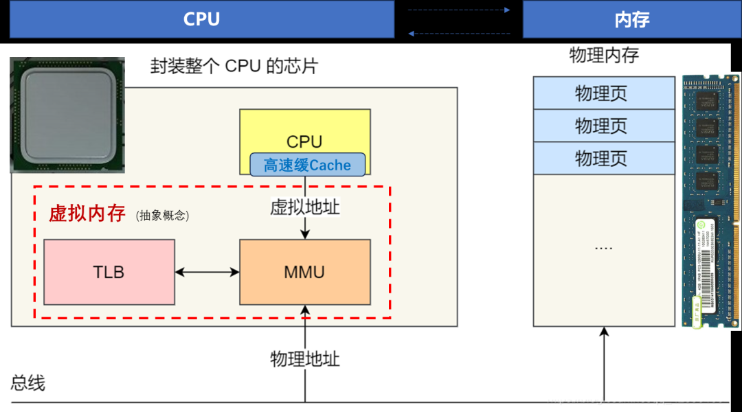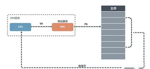 如上图,CPU 访问主存的时候会将一个虚拟地址(virtual address)被内存管理单元(Memory