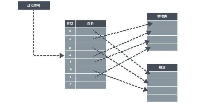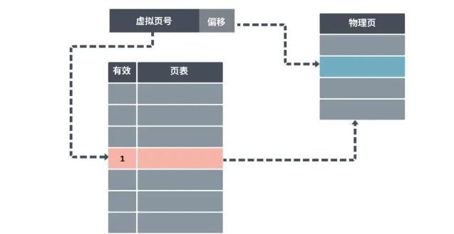 1 位表示有效位,如果该位无效就不在主存中,发生一次缺页;如果有效,那么就可以拿到对应的物理页号获取到对应的物理页位置,再根据偏移量得到物理内存地址。
