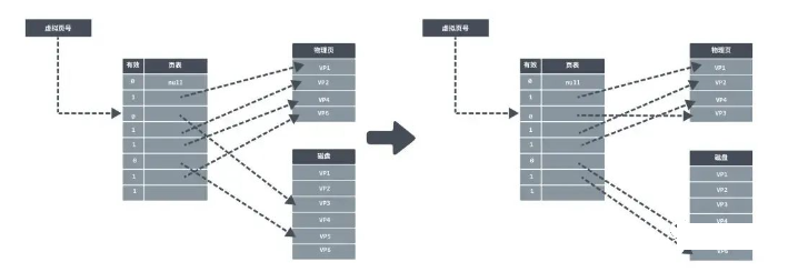 如果主存满了,那么会选择一个牺牲页,大多数操作系统会使用 LRU 替换策略来进行页的替换。操作系统会查找最少使用的页,被替换的页会写入磁盘的交换区(swap