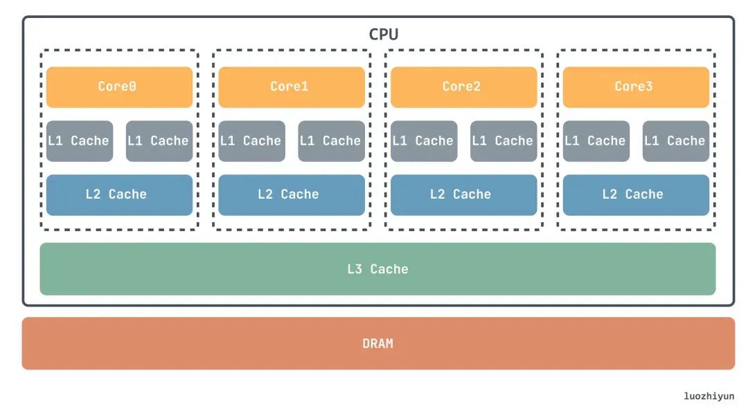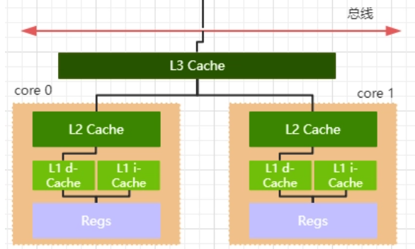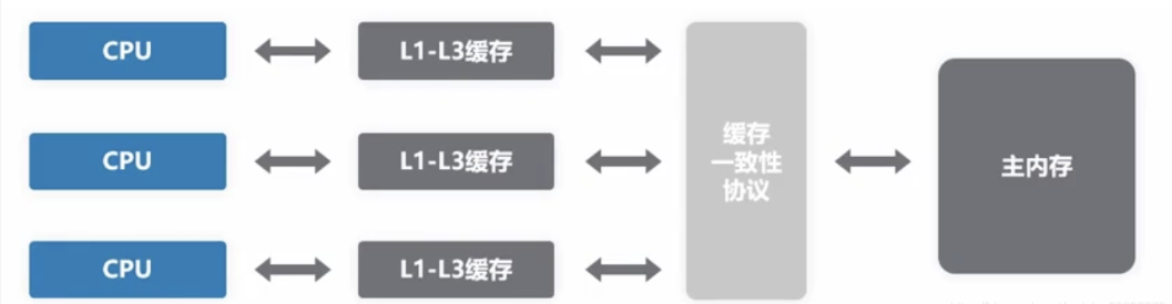 从上面我们可以知道, CPU 的缓存结构一般由 L1、L2、L3 三层缓存结构组成,CPU 读取数据只与缓存交互,不会直接访问主存,所以