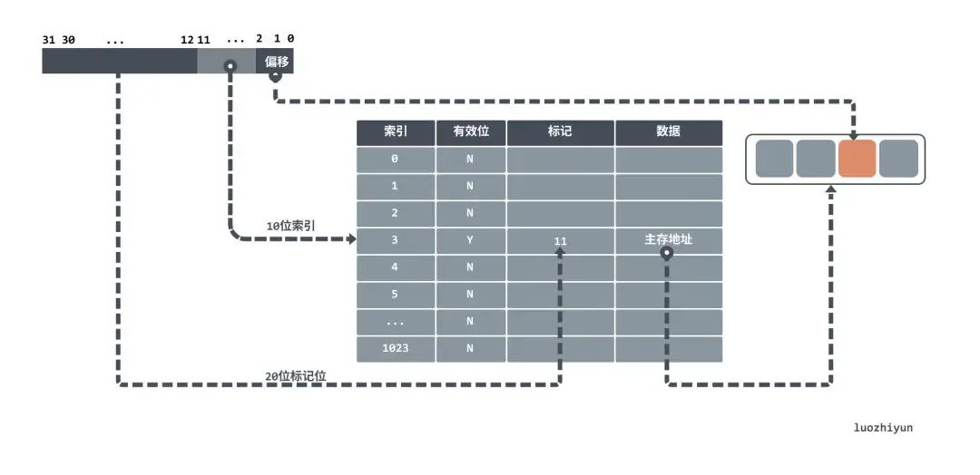中查找数据,那么会取地址 10 位进行取模找到对应的 cache 行,然后取出 20 位与 cahce