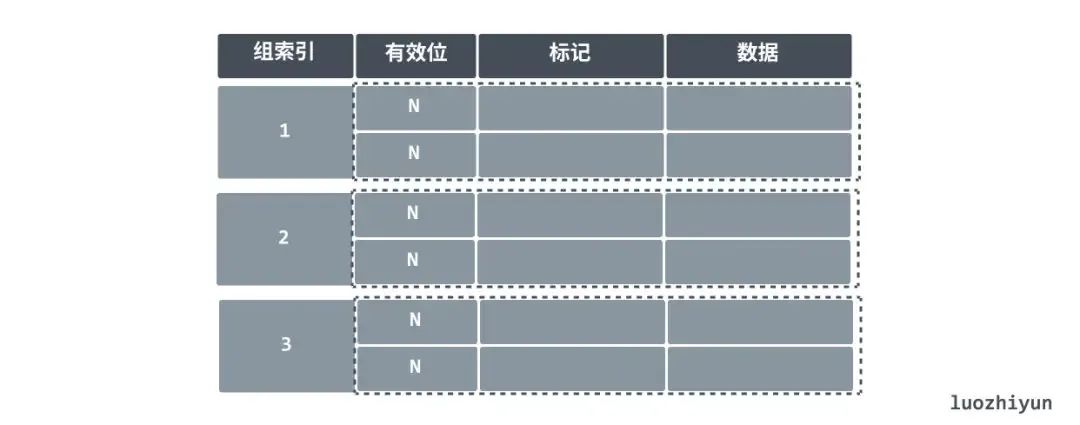组相联就是使用组索引代替了原来的索引,下图中表示每组有 2 行数据,通过组索引找到对应的数据行之后通过有效位和标记对组中每一行进行检索,如果能匹配上就说明命中。