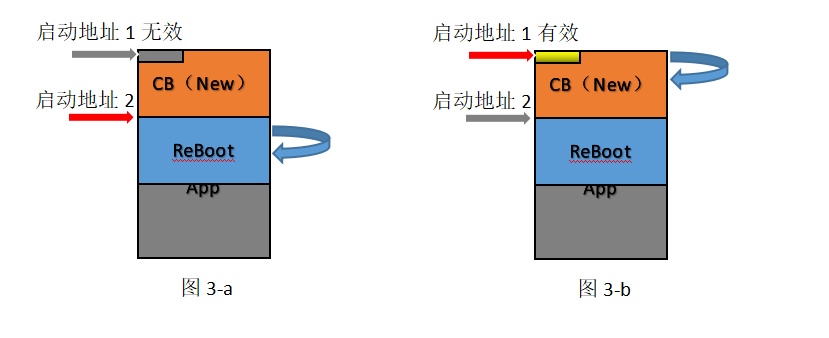 如图 2-a,运行Reboot更新CB途中断电。重新上电后,如图2-b,由于启动地址1的内容是在刷新开始就被更新了是有效的,程序会进入CB运行,但是CB不完整,必然运行出错,程序不会跳入ReBoot里,从而不能再刷新(即刷死)。假设从擦除完旧CB开始到刷入新CB完成的时间有10S,在此期间掉电的可能性也不能忽略。