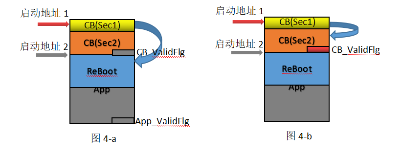如图4-b,当Sec1的逻辑检测到CB_ValidFlg有效时,即认为Boot刷新完成,则程序控制跳转入Sec2里,此时由于App(ReBoot)末尾的App_ValidFlg是无效的,程序并不会跳转入ReBoot里,接下来就可以刷入新的App了。