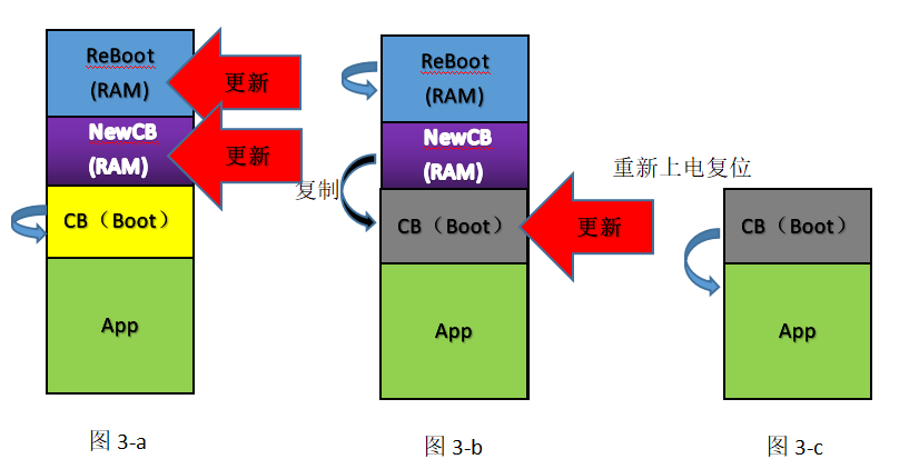 如图2-a,不存在SB情况下,程序启动顺序是CB->App。需要刷新Boot时,首先把Reboot程序下载到不用的RAM里(图2-b),然后在RAM环境下运行ReBoot,下载新的CB(图2-c)