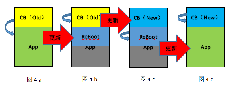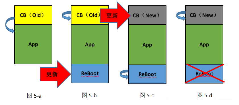 刷新分三步:1.图4-b运行CB,擦除App,把ReBoot下载到App区域。2.图4-c运行ReBoot,擦除旧CB,刷入新CB。3.图4-d运行新CB,刷回App。