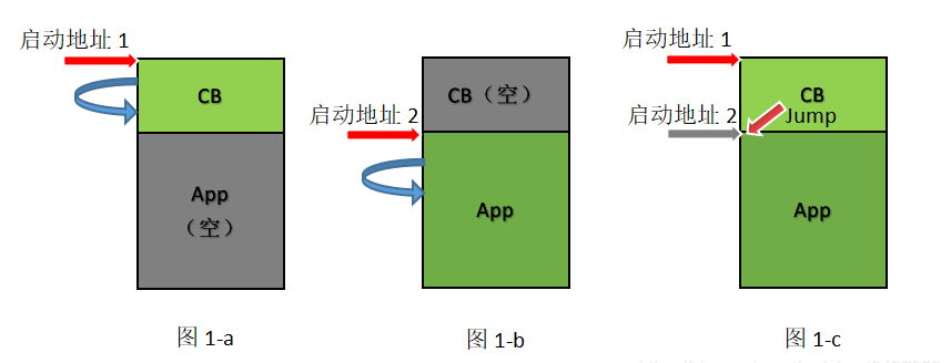 考虑CPU至少具备两个启动地址的情况,如图1-a,当且仅当启动地址1有效时(App为空),程序启动后自动进入Boot。如图1-b,当且仅当启动地址2有效时(不带Boot测试),程序启动后自动进入App。如图1-c,当启动地址1,2都有效势,程序优先从地址1启动,在Boot里检查App程序有效时,再靠跳转指令Jump到启动地址2,开始运行App。