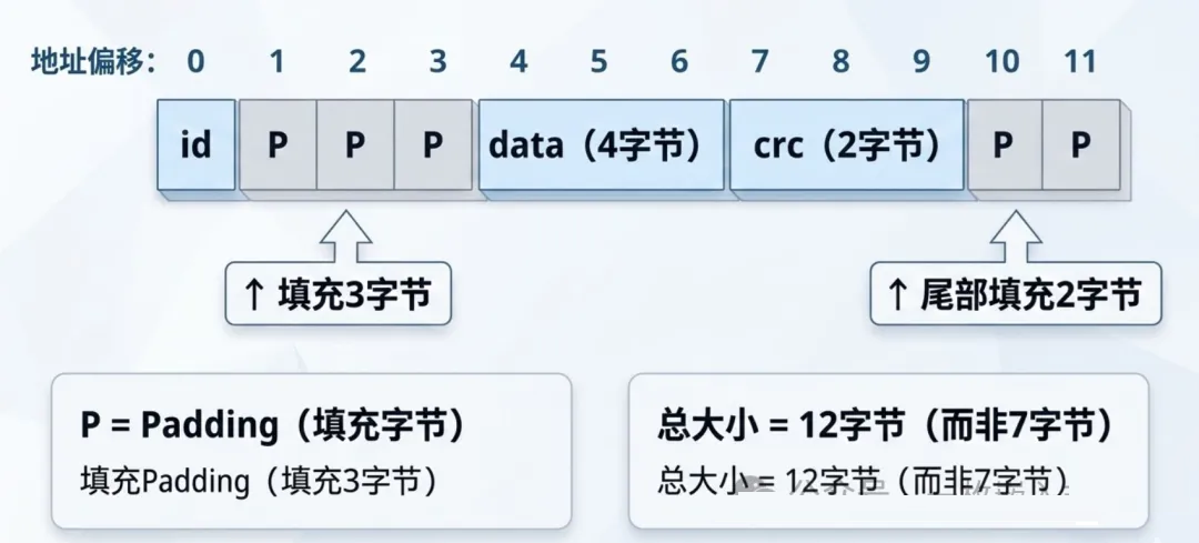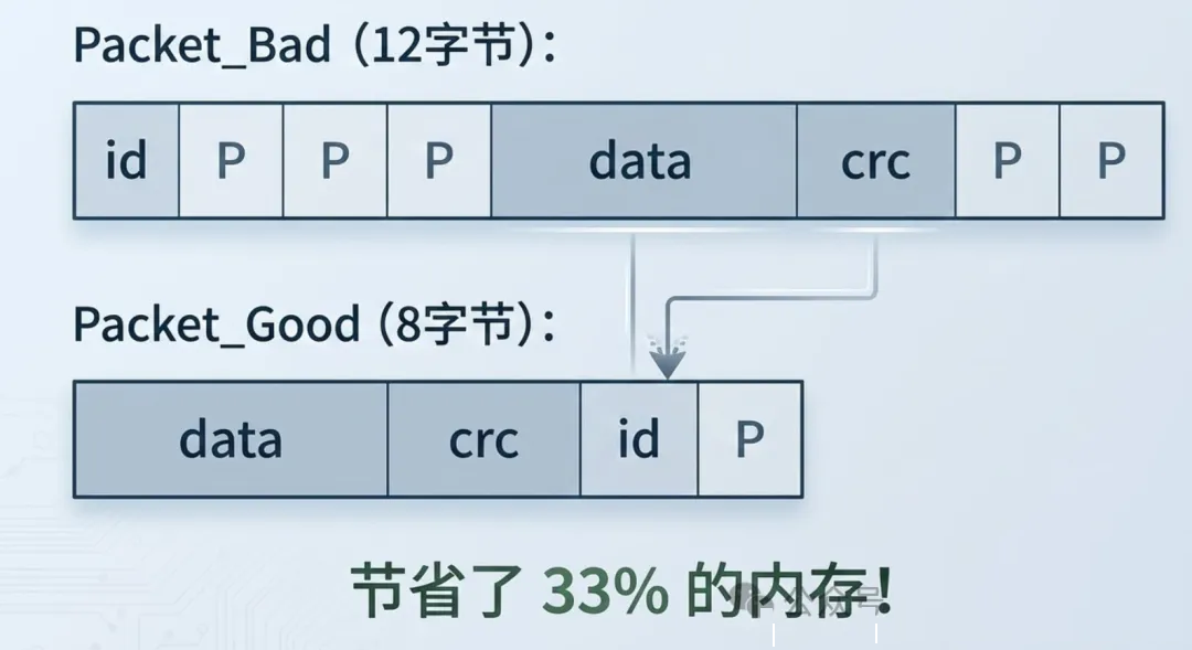 // ❌ 浪费内存的写法 typedef struct { uint8_t id; // 偏移0,后面填充3字节 uint32_t data; // 偏移4 uint16_t crc; // 偏移8,尾部填充2字节 } Packet_Bad; // sizeof = 12