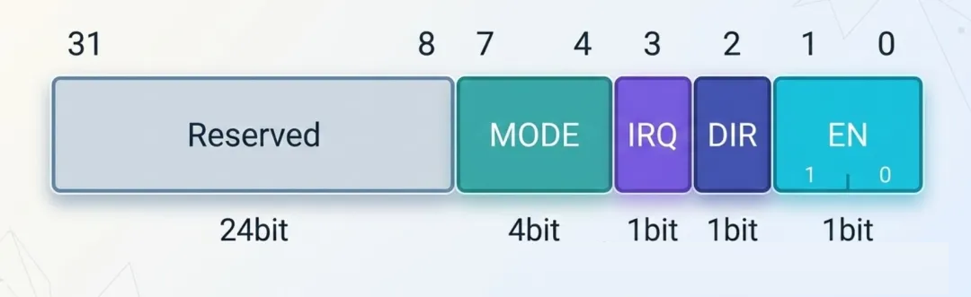 ctrl->enable = 1; // 使能外设 ctrl->mode = 0x05; // 设置模式 ctrl->irq_en = 1; // 开启中断