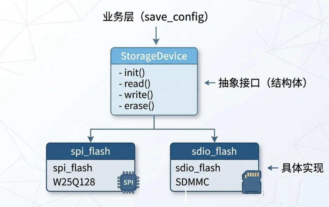 // 调用时传入不同的设备,逻辑完全一致 save_config(&spi_flash, &my_config); save_config(&sdio_flash, &my_config);