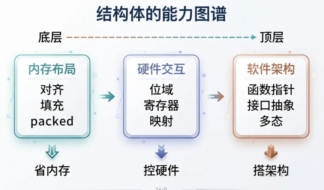 把上面讲的串起来,结构体在嵌入式开发里的能力图谱大概是这样的: