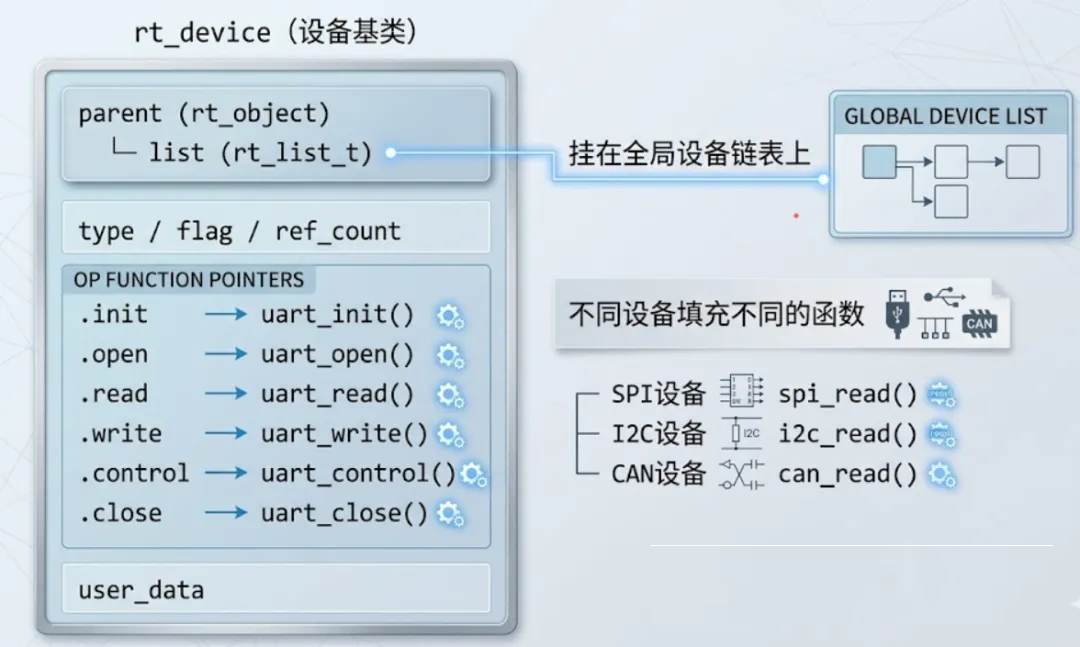 /* ↓ 一组函数指针,定义了设备的"行为接口" */ rt_err_t (*init) (rt_device_t dev); rt_err_t (*open) (rt_device_t dev, rt_uint16_t oflag); rt_size_t (*read) (rt_device_t dev, rt_off_t pos, void *buf, rt_size_t size); rt_size_t (*write) (rt_device_t dev, rt_off_t pos, const void *buf, rt_size_t size); rt_err_t (*control)(rt_device_t dev, int cmd, void *args); rt_err_t (*close) (rt_device_t dev);