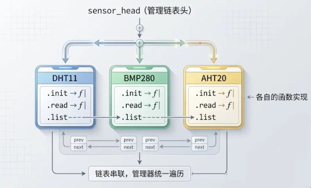 管理器代码有个很重要的特点:它完全不知道具体有哪些传感器。它只认 sensor_device_t 这个"接口",谁来注册都行。