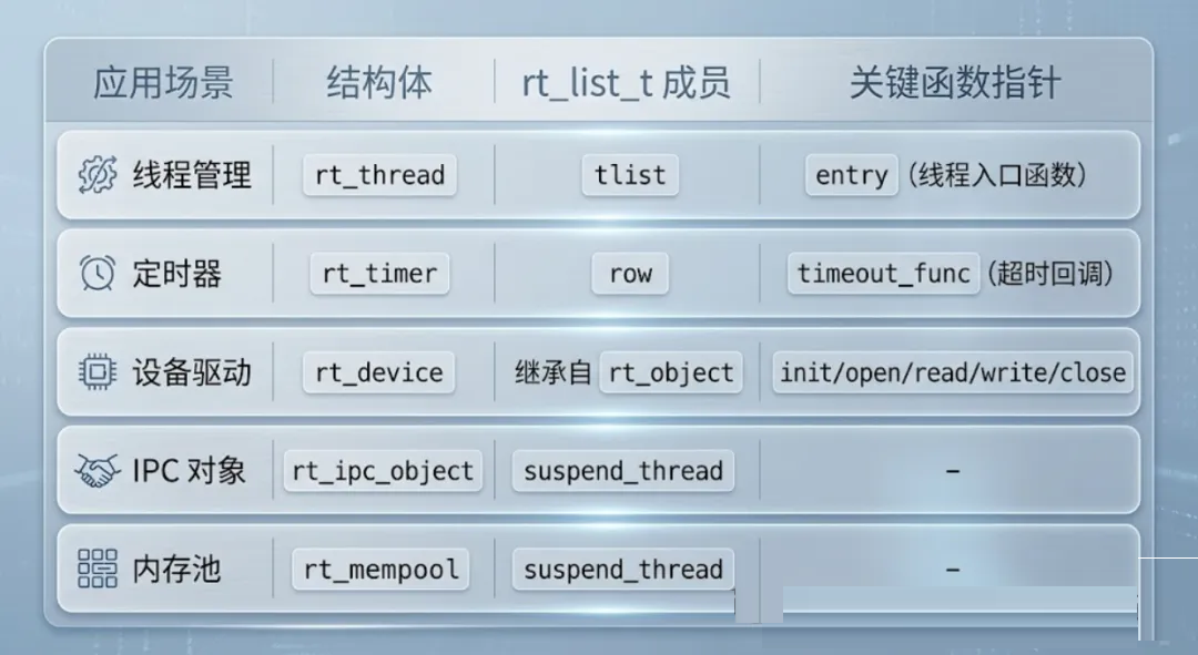 关键不在于 rt_list_t 本身,而在于它和 结构体、函数指针 组合之后能玩出什么花样。这三样东西一旦配合起来,你就能在纯