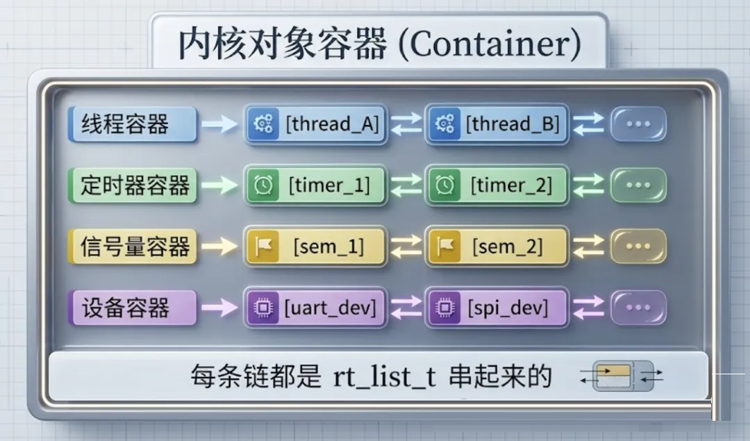 当你调用 rt_object_find() 查找某个内核对象时,RT-Thread 做的事情就是:根据类型找到对应的容器链表头,然后遍历链表逐个比较