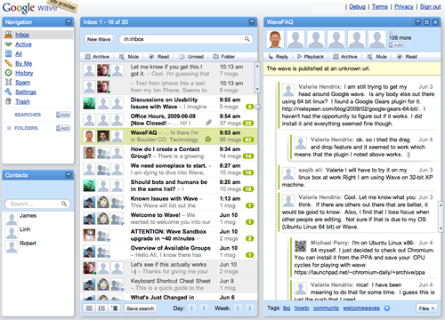 Google Wave是一个不错的例子。Google Wave试图把博客、邮箱、即时通讯以及wikis结合起来,成为一款强大的网络交流服务。它是由HTML5编写的,并不支持在所有浏览器上使用。虽然因为关注度不高被Google停止服务,但Google Wave作为一次尝试,已经在HTML5的发展道路上走了很远很远。