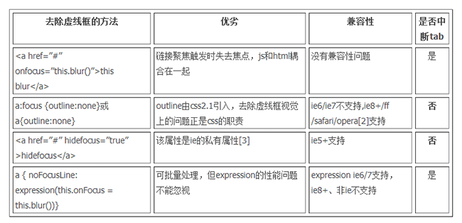 onfocus=”this.blur()”和hidefocus=”true”都可以实现去掉IE6、IE7的点击虚线,但是前者会使链接聚焦触发时失去焦点,焦点重新回到文档的最开始。而后者是IE的私有属性,不会使链接聚焦触发时失去焦点。