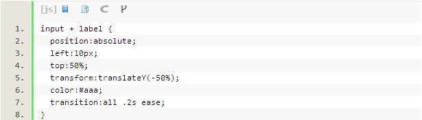 上面的这段代码,可以很清晰看到只是在输入字段定义了样式列表。没有任何特别之处。而下面的这段代码,你就能看到动画效果。规则就是,input + label定义了标签输入样式。通过设定all,可以改变所有的属性,包括属性,位置、尺寸以及色彩。