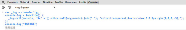 var _log = console.log; console.log = function() { _log.call(console, '%c' + [].slice.call(arguments).join(' '), 'color:transparent;text-shadow:0 0 2px rgba(0,0,0,.5);'); }; |