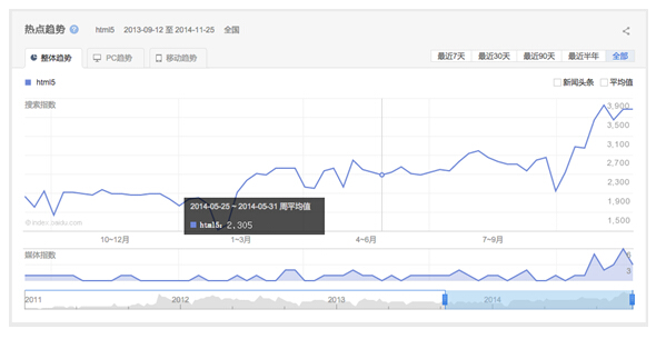 1. 在我开头提到的文章中,作者用了一张2012的HTML5的搜索指数的一张图,可是为什么要引用一张2012年下半年这个两年多前一个特定时段的图呢?(我想肯定有作者自己的原因,我在这里不做推敲)
