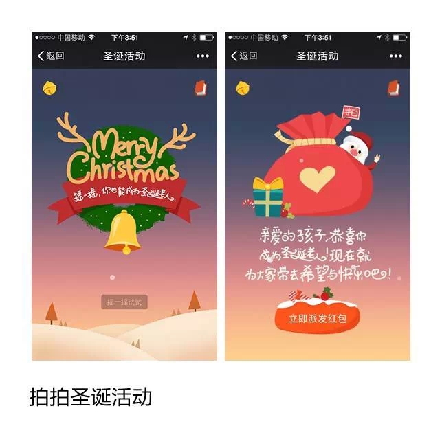 除了翻页以外,还有点击,输入文字,擦除屏幕,滑动屏幕等,玩法非常丰富。在“拍拍圣诞活动”里就用到了重力感应,摇一摇可以随机判断,让用户有了自己参与的乐趣。