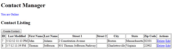 Contact Manager 示例应用程序专为管理联系信息(姓名、地址和电话号码)而提供的。它提供了一种在线模式、一种离线模式,以及一种简单的数据同步化功能,以使本地数据更改与切换到在线模式服务器实现同步。当处于离线状态时,数据于本地持久存储。应用程序支持在线和离线模式下的四个基本持久存储功能:创建、读取、更新和删除