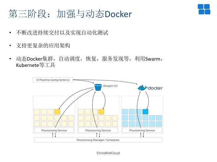 È»ºóÔÚÕâ¸ö»ù´¡ÉÏ£¬ÎÒÃÇÀ´µ½Á˵ÚÈý¸ö½×¶Î£¬ÕâʱºòÎÒÃÇÏ£Íû¿ÉÒÔ¶ÔµÚ¶þ¸ö½×¶Î×öÈ«·½Î»µÄ¼ÓÇ¿£¬°üÀ¨ºÜ¶àϸ½Ú£¬±ÈÈç²»¶Ï¸Ä½ø³ÖÐø½»¸¶ÒÔ¼°ÊµÏÖ×Ô¶¯»¯²âÊÔ£¬Ö§³Ö¸ü¸´ÔÓµÄÓ¦Óüܹ¹£¬²¢ÇÒ¿ÉÒÔÓµÓÐÒ»¸ö¶¯Ì¬µÄDocker²¿ÊðºÍµ÷¶È£¬ÀûÓÃSwarm£¬KuberneteµÈ¹¤¾ß£»