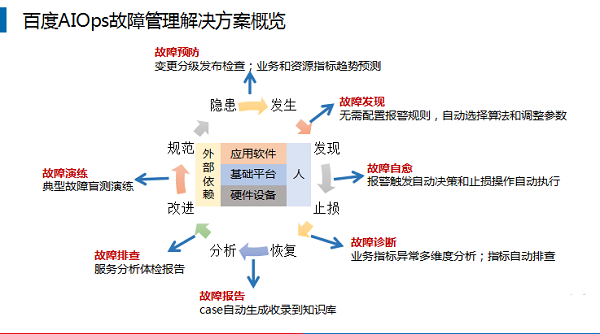 故障的完整生命周期包括隐患阶段、故障发生、故障发现、故障止损、故障恢复、故障分析、故障改进和故障规范阶段,每个阶段都可以使用AIOps相关的方法提升故障管理的质量。如下图所示。