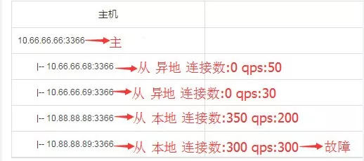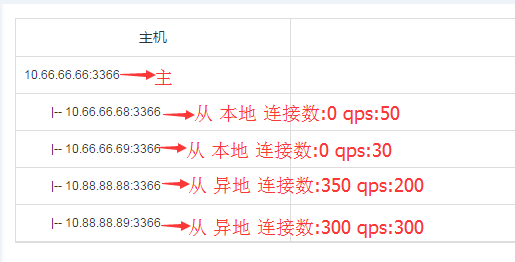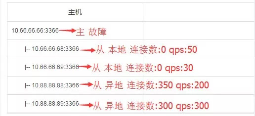 选目标实例,假如例子中的4个从都是存活的,那么根据先本地后异地原则,选出10.66.66.68:3366,10.66.66.69:3366,然后再去查连接数,在连接数都相同的情况下,则去比较QPS,选出QPS负载低的10.66.66.69:3366作为目标实例: