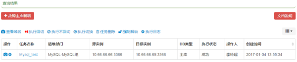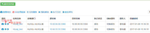 监控系统会自动创建任务,并根据先本地后异地原则,然后再查连接数、QPS,确定目标实例为10.88.88.88:3366,进行自动切换,DBA可在切换任务列表查看详情。