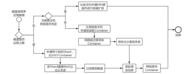 垂直升级:首先会进行资源check,看宿主机是否有足够的剩余硬盘资源进行垂直升级,若check通过,则会在宿主机施加全局资源锁,并对硬盘进行垂直扩容再增加64G。若check不通过,则在宿主机上提供一个硬盘大小为:磁盘容量+64G大小,CPU和内存与当前容器相同的新容器,并将数据库服务迁移到新的容器上。垂直升级是瞬间完成的不会影响数据库服务。