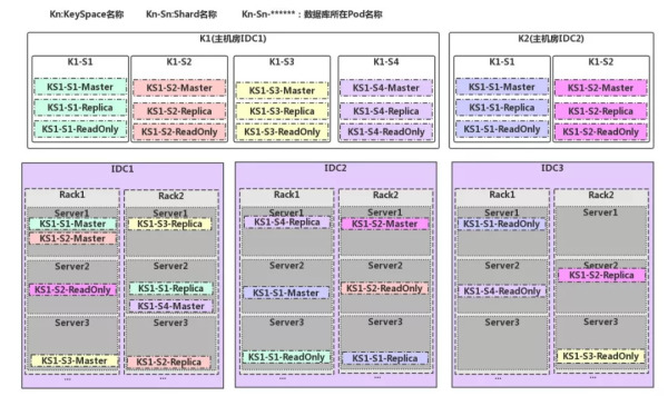 每个KeySpace都有一个主机房,属于同一个Shard中的数据库实例(目前一个shard中包含1主2从)的资源分配尽量应该满足:Master必须属于主机房,不能有任意两个实例属于同一机架,不能有任意三个实例在同一IDC,这种策略可以避免某一机柜掉电而导致主从同时出现故障,也可以避免IDC故障从而导致所有数据库实例均不可用。