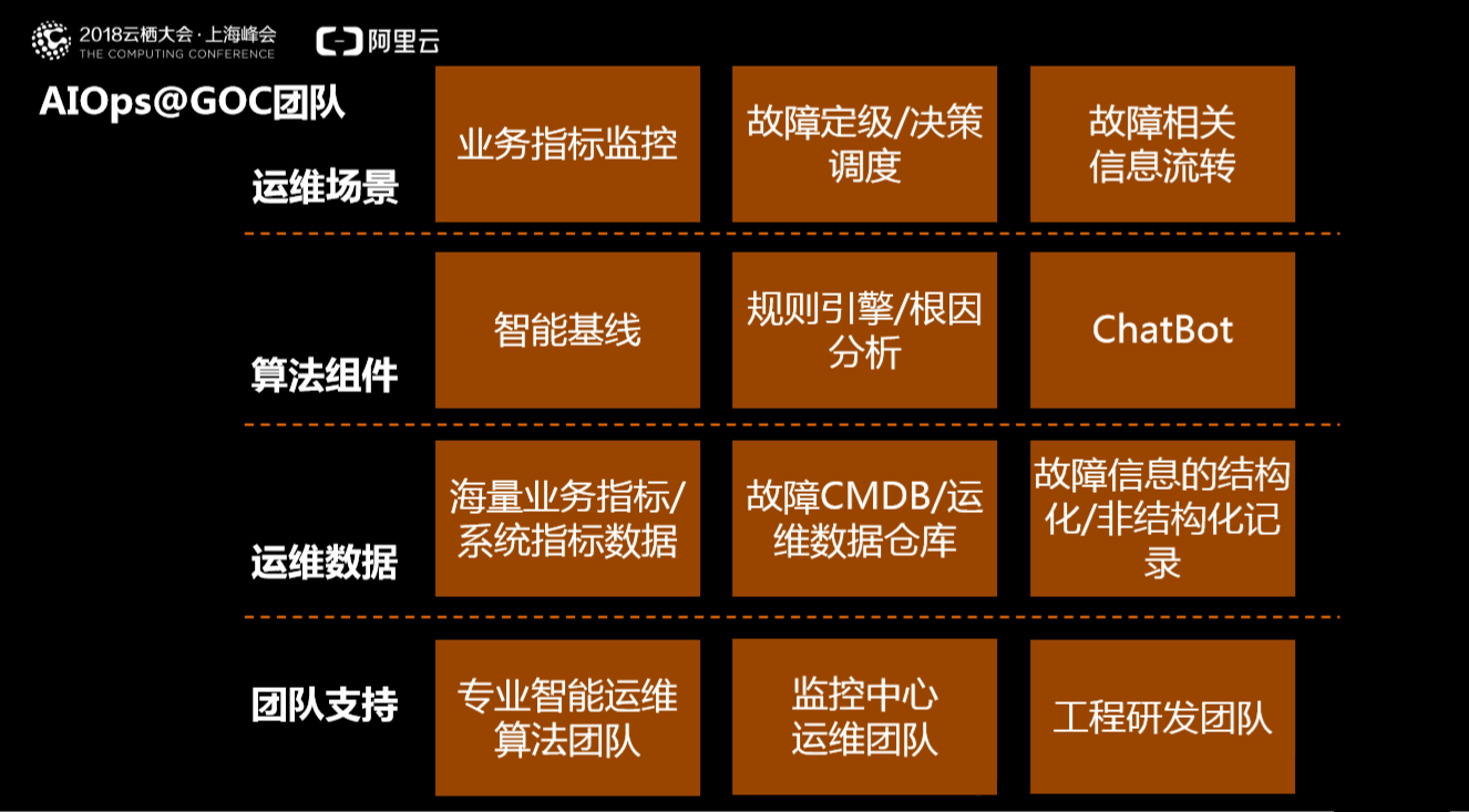 上图给出了GOC团队已具备的技术及条件。基于对系统智能化的探索,GOC团队发现其在很多运维层面已经具备了优势条件。在运维场景层面,GOC团队拥有很多可以应用算法的场景,比如业务指标监控,故障定级/决策调度,故障相关信息流转等。在算法层面,GOC通过专业的算法团队研制出了智能基线,规则引擎及Chatbot等主要算法。而算法的背后,离不开海量数据的支持,GOC团队通过与阿里巴巴其他团队的业务合作得到海量的数据,将这些数据加以孵化来得到更多高质量的算法。在团队支持层面,GOC团队拥有专业的算法团队,监控中心运维团队,工程研发团队等多团队的支持。正是这些客观主观因素决定下,GOC团队做到了很多优秀的实现案例。