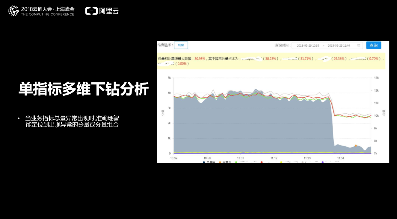 这种算法适用于单一指标的监控。当业务指标出现总量异常时,单指标多维下钻分析算法往往可以在秒级的时间内准确地定位到出现异常的分量或分量组合。