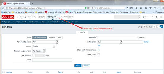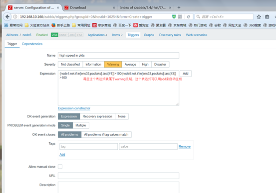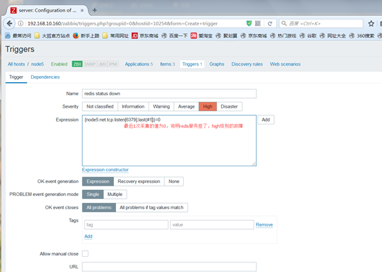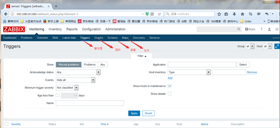 触发器(trigger):一个表达式,用于评估某监控对象的某特 定item内所接收到的数据是否在合理范围内,即阈值;接收
