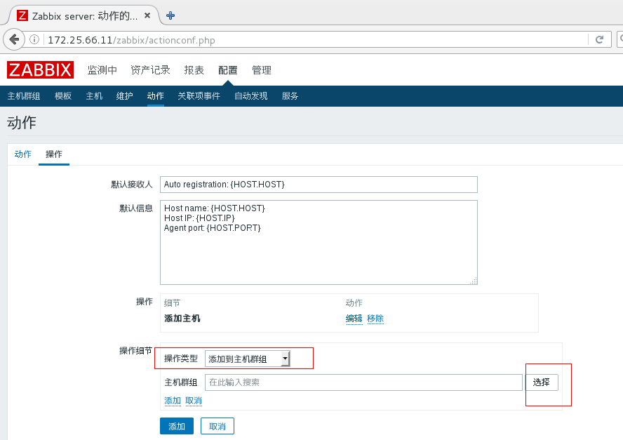 在动作中的名称中填写agent的主机名server1
