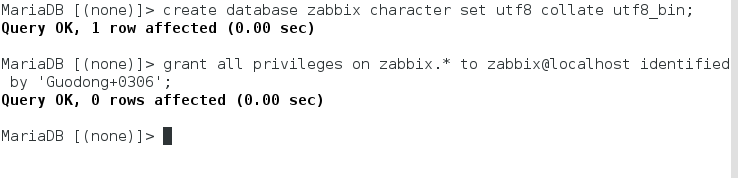 grant all privileges on zabbix.* to zabbix@localhost identified by ‘Guodong+0306’;