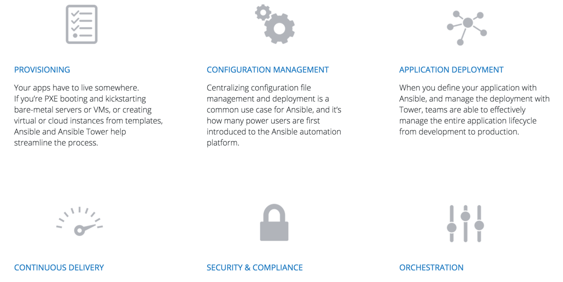 配置管理、应用部署等。配置管理工具有Chef, Puppet, Salt等,应用部署(将代码编译或打包然后传输到服务器部署并启动服务)工具有Capistrano,Fabric等,ansible集两者于一身,操作很简单但是功能强大。此外,还可以对多个服务器进行服务编排,支持openstack,amazon