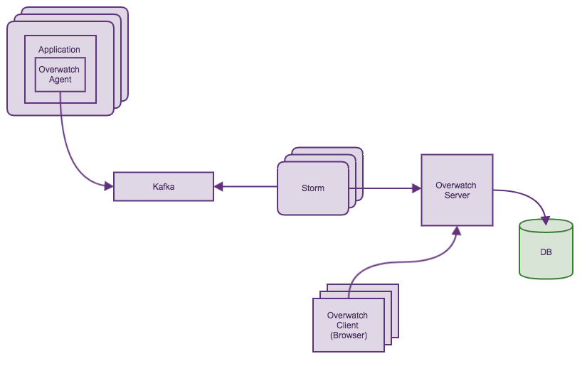 但是我们需要自己实现信息的收集以及聚合,同时我们需要一个在服务进程中的Agent去收集RPC信息。我们采用了Kafka进行数据的收集,Storm进行数据的聚合,最后将数据交给Overwatch服务进程进行存储和展现。这样我们可以做到一个延迟在秒级的实时监控系统。