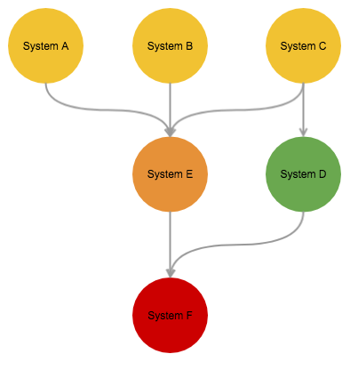 我们使用三个同心圆表示一个节点,每个圆的颜色根据该系统所有RPC调用的成功率从蓝(100%)到黄(<99.9%)到红(<99%)。最内侧的圆表示最近一分钟的成功率;中间的圆表示最近5分钟的成功率;最外侧的圆表示最近15分钟的成功率。通过这三个同心圆,我们就可以直观了解到该系统当前的状态以及最近15分钟的变化。