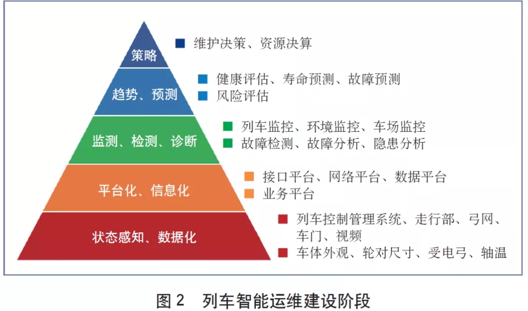 阶段主要通过数据的积累和机理的分析,实现列车健康评估、寿命预测、故障预测和风险评估;第5 阶段主要完成列车运维的决策和资源的优化利用,如图2