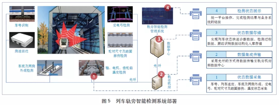 针对轨旁多系统独立部署所导致的模块重复、多系统操作、数据管理不统一、部署维护不协同、无法直接应用于检修业务等问题,采用轨旁设备统一设计安装、设备互联互通、统一操控等方式,对部件状态进行采集、传输、处理,如图5